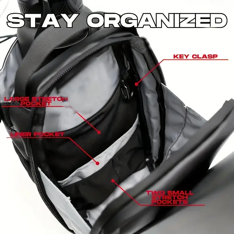Im Inneren bietet die Tasche mehrere praktische Fächer, in denen du deine Essentials wie Schlüssel, Handy, Geldbörse oder Kopfhörer sicher und übersichtlich verstauen kannst. So hast du immer Ordnung, findest alles sofort und musst nicht lange suchen – perfekt für Training und Alltag.